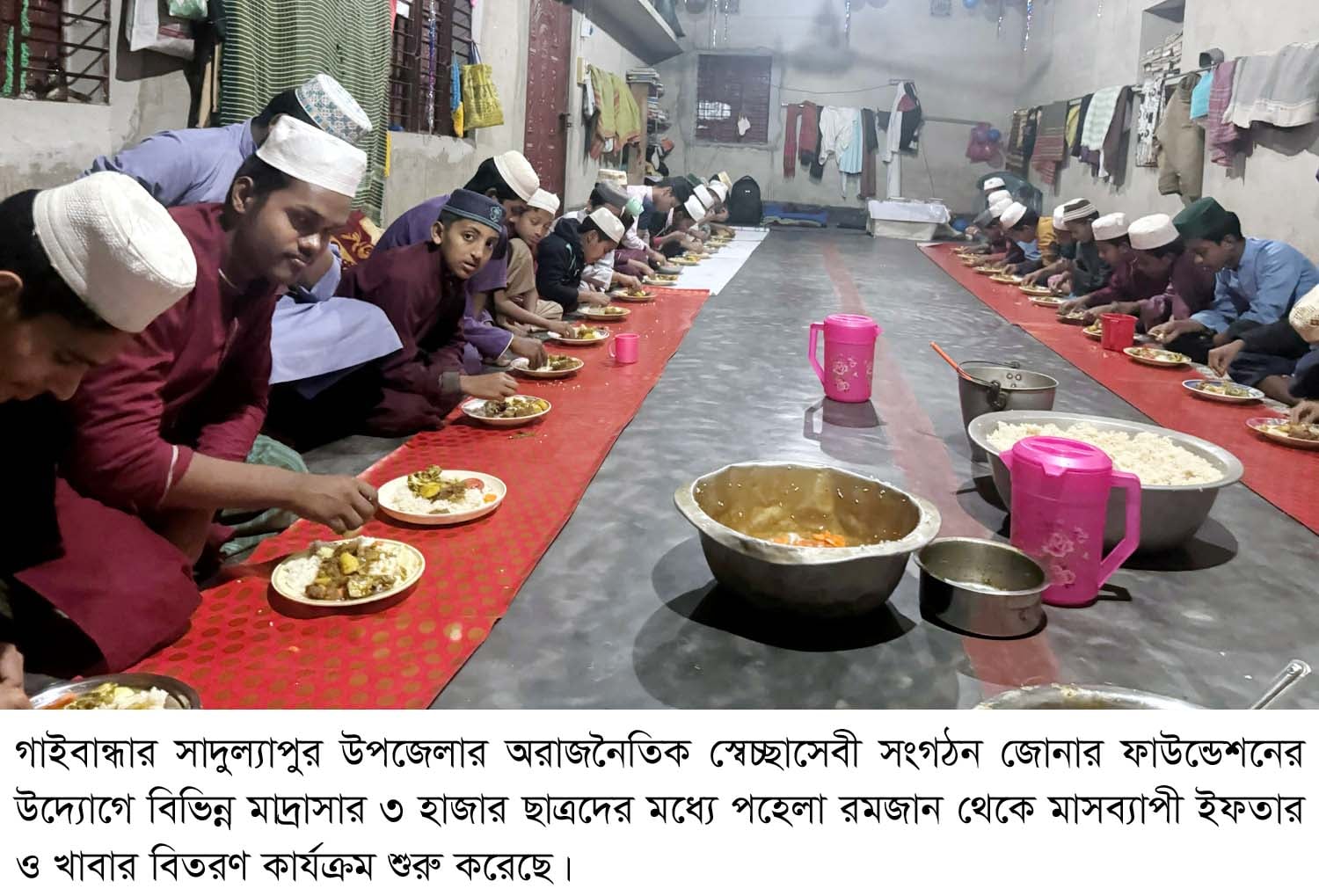 গাইবান্ধার সাদুল্যাপুর উপজেলার অরাজনৈতিক স্বেচ্ছাসেবী সংগঠন জোনার ফাউন্ডেশনের উদ্যোগে বিভিন্ন মাদ্রাসার ৩ হাজার ছাত্রদের মধ্যে পহেলা রমজান থেকে মাসব্যাপী ইফতার ও খাবার বিতরণ কার্যক্রম শুরু করেছে।