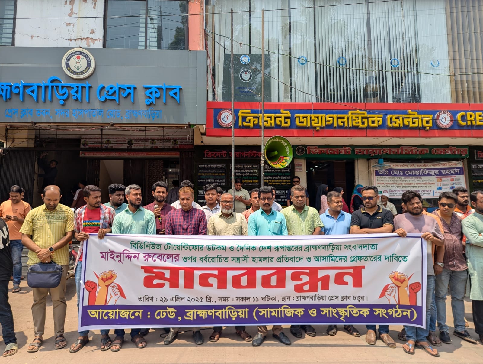 মানববন্ধনে বক্তব্য রাখেন ব্রাহ্মণবাড়িয়া প্রেসক্লাবের সাধারণ সম্পাদক মো. বাহারুল ইসলাম মোল্লা, অর্থ সম্পাদক মোশাররফ হোসেন বেলাল, কার্যকরি সদস্য শাহজাহান সাজু, খেলাঘরের সাধারণ সম্পাদক নীহার রঞ্জন সরকার, ব্রাহ্মণবাড়িয়া ইউনাইটেড কলেজের উদ্যোক্তা ও পরিচালক হারুন অর রশিদ, পরিচালক শাহীন মৃধা, সংস্কৃতিকর্মী অভিজিৎ রায়, শাহজাহান মিয়া, শাহাদাত হোসেন। মানববন্ধনে বক্তারা বলেন, জড়িতদের গ্রেপ্তার দাবি জানিয়ে বলেন, ‘হামলা করে, ভয়ভীতি দেখিয়ে সাংবাদিকদেরকে দমিয়ে রাখা যাবে না।’