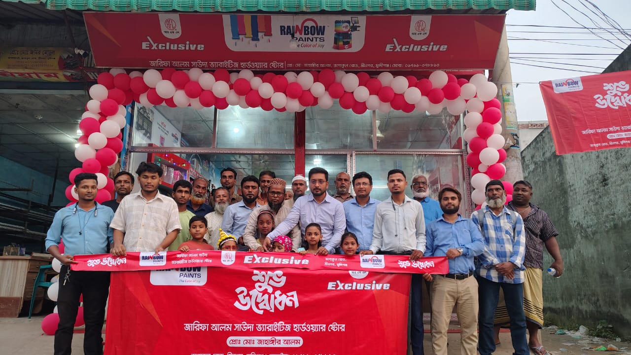 এ সময় উপস্থিত ছিলেন, কোম্পানির পক্ষে আরএফএল রেইনবো পেইন্টস এর বিজনেস হেড মোঃ ফয়সাল সালেহ, অপারেশন মোঃ সেলিম হোসেন, এক্সক্লুসিভ এজিএম মোঃ রাশেদ হোসেন, জোনাল ম্যানেজার মোঃ সুমন মল্লিক, এক্সক্লুসিভ এসিস্ট্যান্ট ম্যানেজার মোঃ মনিরউজ্জামান, এসআরএম মোঃ মাইদুল ইসলাম, এসডিও মোঃ শাকিল হোসেন এবং সেলস অফিসার মোঃ জাহাঙ্গীর হোসেন। স্থানীয় গন্যমান্য প্রমূখ। জারিফা আলম সাউদার প্রোপাইটর জাহাঙ্গীর আলম তিনি বলেন, এখানে আরএফএল কোম্পানির রেইনবো ব্র্যান্ডের সকল প্রকার রং খুচরা ও পাইকারি সুলভ মূল্যে পাওয়া যায়। আপনারা রেইনবো ব্র্যান্ডের রং অন্যত্র থেকে ক্রয় করে প্রতারিত হবেন না সরাসরি এখানে যোগাযোগ করবেন।