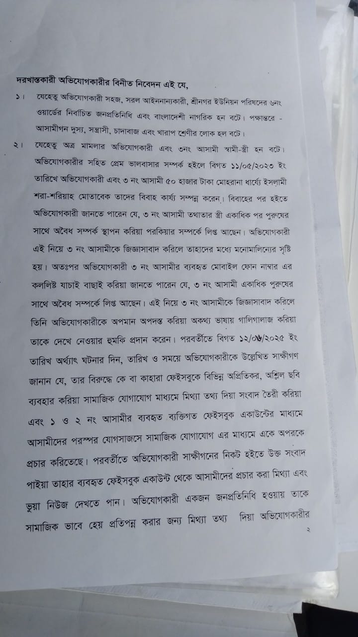 মুন্সীগঞ্জর শ্রীনগরে স্ত্রী ও পরকিয়া প্রেমিকের বিরুদ্ধে পর্ণোগ্রাফি নিয়ন্ত্রণ আইনে মামলা দায়ের করা হয়েছে। উপজেলার সদর ইউনিয়নের মথুরাপাড়া গ্রামের ভূক্তভোগী ইউপি সদস্য মোঃ স্বপন (৪৫) মুন্সীগঞ্জ সিনিয়র জুডিসিয়াল ম্যাাজিষ্ট্রেট আমলী ৩ আদালতে গত ১৭ জুন আব্দুল কাইয়ুম(মাইজভান্ডারী) (৪০) ও নজরুল ইসলাম (৫০) এর বিরুদ্ধে এ পর্ণোগ্রাফি নিয়ন্ত্রণ আইনে সি.আর মামলা দায়ের করেন। যাহার সি.আর মামলা নং- ৪৫৬/২৫। মামলার অভিযোগ সূত্রে জানাযায়, ২০২৩ সালে ইউপি সদস্য স্বপনের সাথে পূর্বদেউল ভোগ গ্রামের নুরুল হক বেপারীর মেয়ে সেলিনা আক্তারের ইসলামী শরিয়াহ মোতাবেক বিবাহ হয়। বিবাহের কয়েক মাস যেতে না যেতেই ইউপি সদস্য স্বপন জানতে পারেন তার স্ত্রী সেলিনা আক্তারের সাথে একাধিক ব্যক্তির অবৈধ সম্পর্ক ও পরকিয়া রয়েছে। এ নিয়ে তাদের স্বামী-স্ত্রীর মাধ্যে মনোমানিল্য সৃস্টি হয়। এ দিকে মোঃ স্বপন জানতে পারেন তার স্ত্রীর দুই পরকিয়া প্রেমিক আব্দুল কাইয়ুম(মাইজভান্ডারী) (৪০) ও নজরুল ইসলাম (৫০) তাদের ব্যক্তিগত ফেইসবকে বিভিন্ন অপ্রিতিকর ও অশ্লিল ছবিব্যবহার করিয়া বিভিন্ন সামাজিক যোগাযোগ মাধ্যমে প্রচার করছেন। ইউপি সদস্য স্বপন অপ্রিতিকর ও অশ্লিল ছবিব্যবহারের বিষয়টি সেলিনা আক্তারের পরকিয়া প্রেমিক আব্দুল কাইয়ুম ও নজরুল ইসলামকে জিজ্ঞেস করলে, তারা ইউপি সদস্য স্বপনের কাছে ৫ লক্ষ টাকা দাবি করেন এবং তাকে হত্যার হুমকী প্রদান করে বলে মামলায় অভিযোগ করেন।