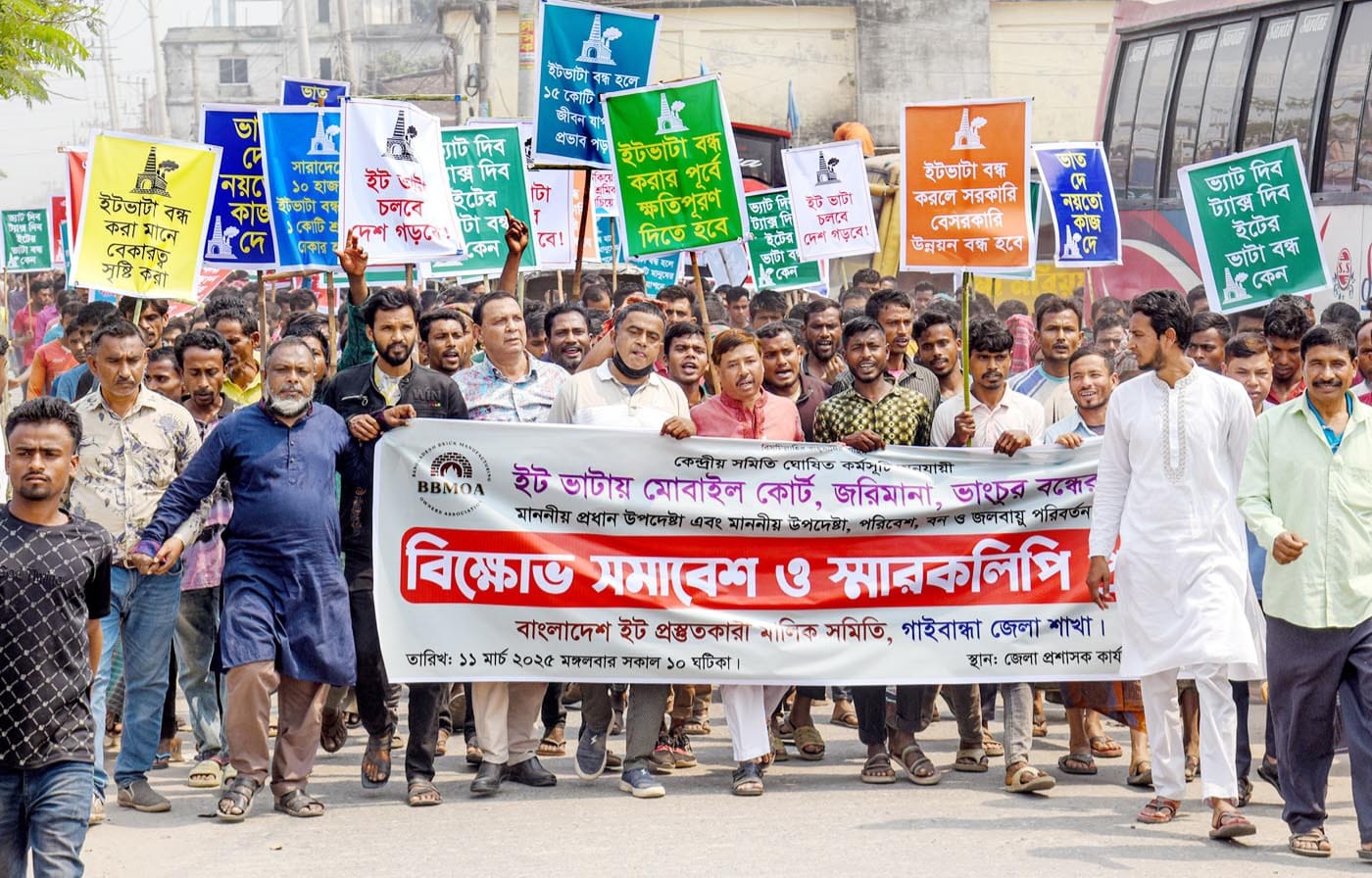 ইটভাটায় মোবাইল কোর্ট, জরিমানা ও ভাং চুরের বিরুদ্ধে গাইবান্ধার ভাটা মালিক ও শ্রমিকরা বিক্ষোভ মিছিল ও জেলা প্রশাসকের কাছে স্মারকলিপি দিয়েছে। মঙ্গলবার জেলার সব ইট ভাটার হাজার হাজার শ্রমিক ও মালিকরা জেলা শহরে বিক্ষোভ মিছিল করেন। পরে জেলা প্রশাসকের কার্যালয়ে গিয়ে বন, পরিবেশ ও জলবায়ু পরিবর্তন মন্ত্রণালয়ের উপদেষ্টা বরাবরে জেলা প্রশাসকের মাধ্যমে স্মারকলিপি প্রদান করা হয়। স্মারকলিপি গ্রহণ করেন অতিরিক্ত জেলা প্রশাসক (সার্বিক) একেএম হেদায়েতুল ইসলাম। গাইবান্ধা জেলা ইট প্রস্তুতকারী মালিক সমিতির ব্যানারে এই কর্মসূচি পালিত হয়।