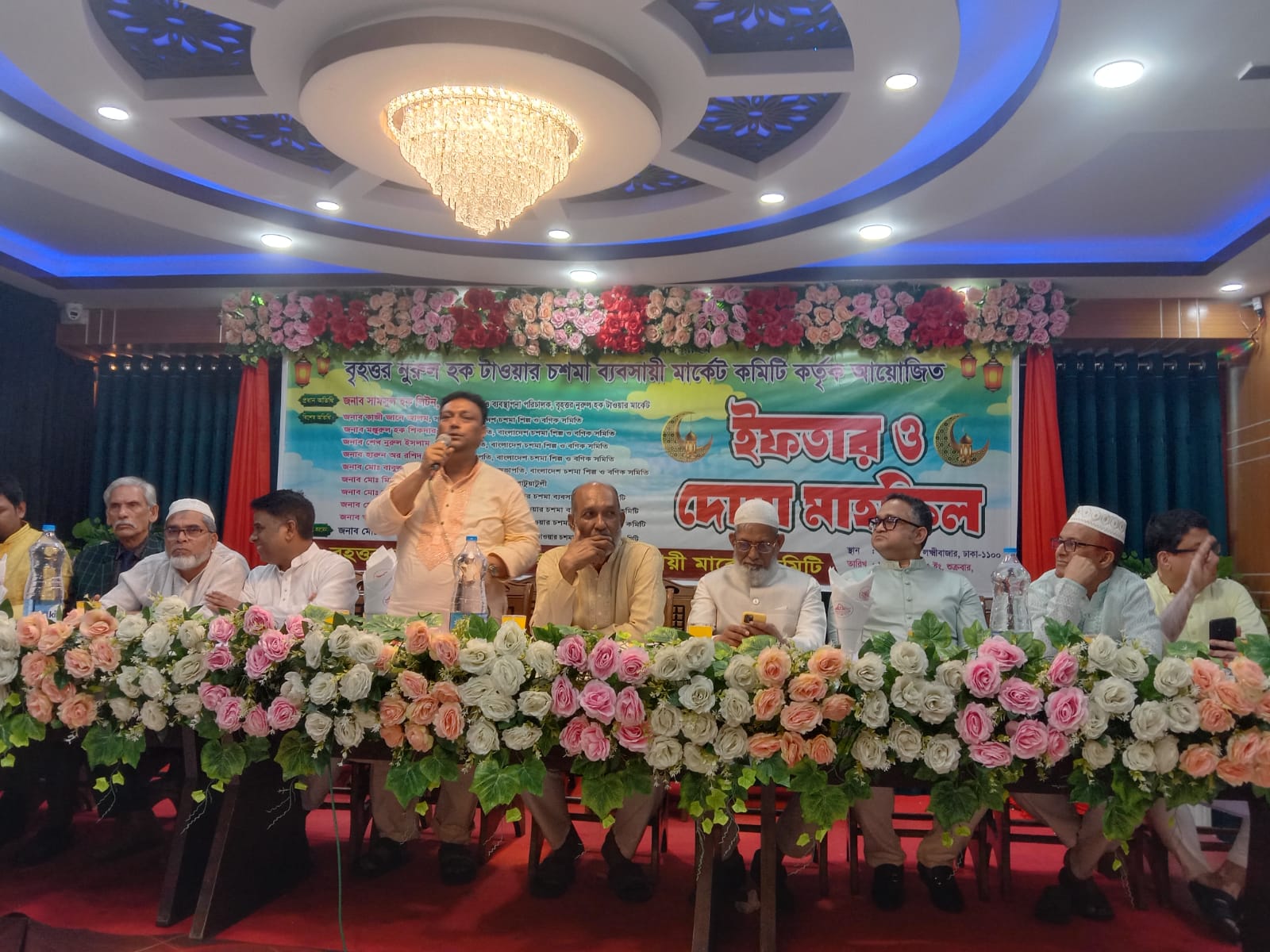 আবুল কালাম আজাদ ঢাকা থেকে। ১৪ই মার্চ রোজ শুক্রবার বিকাল চার ঘটিকায়। বৃহত্তর নুরুল হক টাওয়ার চশমা ব্যবসায়ী মার্কেট কমিটি কর্তৃক আয়োজিত ইফতার ও দোয়া মাহফিল। প্রধান অতিথি জনাব শামসুল হক লিটন ভাই প্রধান উপদেষ্টা ও ব্যবস্থাপনা পরিচালক। বিশেষ অতিথি ইনজামামুন হক মন্ত্রী। আরো উপস্থিত ছিলেন জনাব কাজী জানে আলম জনাব মঞ্জুরুল হক শিকদার জনাব শেখ নুরুল ইসলাম জনাব মোঃ বাবুল হোসেন জনাব মোঃ মিজানুর রহমান। জনাব মোঃ নূর ইসলাম জনাব মোঃ খলিলুর রহমান জনাব মোঃ আবুল কালাম আজাদ। সভাপতিত্ব করেন জনাব মোঃ কামরুজ্জামান সবুজ। সাধারণ সম্পাদক দেলোয়ার হোসেন। সঞ্চালনায় ছিলেন মোনা এম মাহফিল অনুষ্ঠান টি অনুষ্ঠিত হয় ঢাকার লক্ষীবাজার উইডিং ক্লাব এন্ড কনভেশন সেন্টার। শামসুল হক লিটন ভাই বলেন ইফতার ও দোয়া মাহফিলটি প্রতিবছর সুন্দর ও সমৃদ্ধ মনোরম পরিবেশে আয়োজন করা হয় অবশেষে দোয়া ও মোনাজাতের মধ্য দিয়ে অনুষ্ঠানটি সমাপ্তি করা হয়।